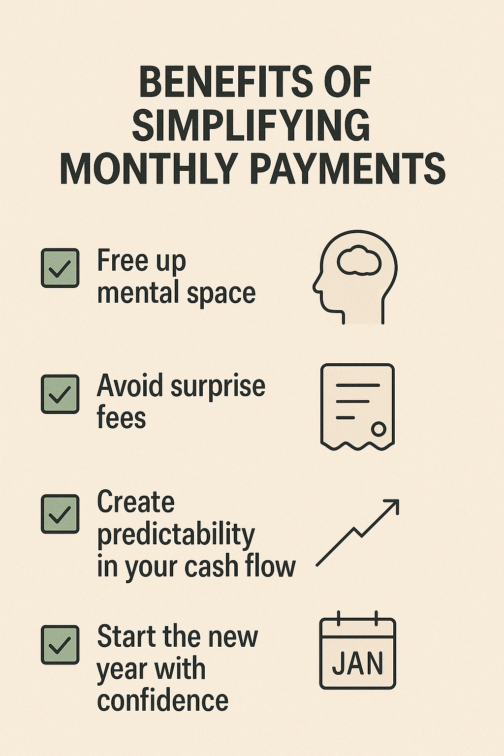 By bringing order to your monthly payments, you'll: